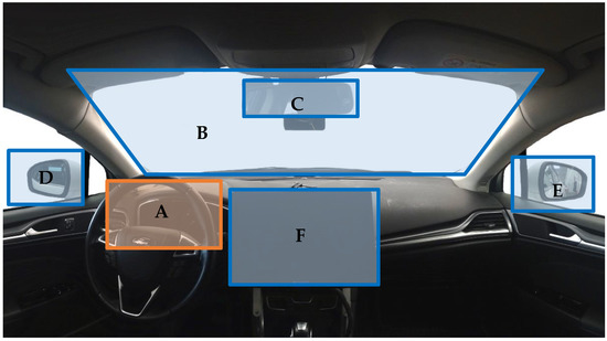 Areas of interest (AOI) in the experimental setup. A: dashboard; B: windshield; C: rear mirror; D: left mirror; E: right mirror; F: SURT Tablet. Only the dashboard AOI is used in analysis. The others were used for better evaluation of data validity.