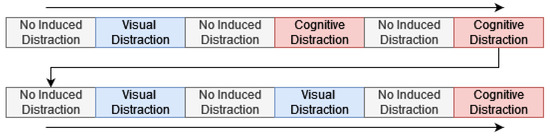 After giving their written informed consent for participating in the study, participants were instructed to drive a specific route and return to the starting point afterwards, which took about 40 min in total per trial. After they were guided to the highway, they drove for a couple of minute freely before the data collection and the study began. With a constant speed of about 100 km/h, the participants conducted various side tasks while driving. Each side task took about one minute and was given three times in total with a segment of undistracted driving in between. Figure 4 depicts the order of the experimental conditions.