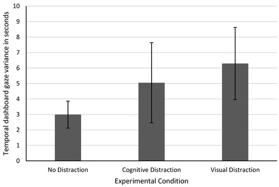 As a first step, we investigated the assumption underlying our hypothesis that temporal variance in speedometer gazes increases under cognitive distraction. This was done by calculating the average standard deviation for all participants grouped by the experimental condition and comparing the values against each other.