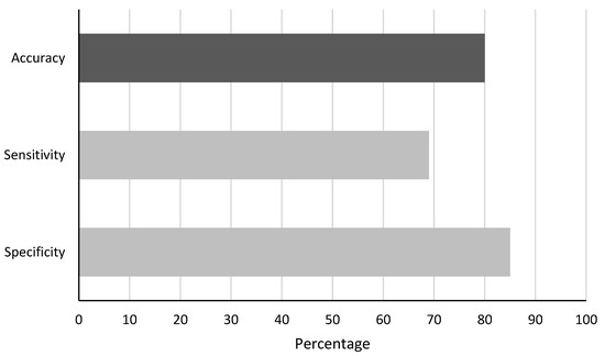 With the above-described detection method and the explained validation method, the detection method achieved an accuracy of 80%. A comparison of the performance parameters is shown in Figure 6.