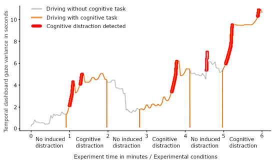 The regular validation of safety-critical information from the environment, such as one’s current speed, is necessary for driving. Keeping regularity in such behavior requires the temporal control of the driver’s gaze. A reduction in the temporal control of this behavior under cognitive distraction leads to the hypothesis that cognitive distraction can be detected by measuring the change in the regularity of dashboard gazes, or, in other words, changes in the temporal dashboard gaze variance (TDGV).