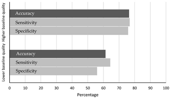 Figure 9 shows the difference between both baseline quality groups on the performance of the distraction detection. Drivers with a higher quality baseline show an accuracy of 76%, with 77% sensitivity and 76% specificity, which is closer to the values measured in the first study.
