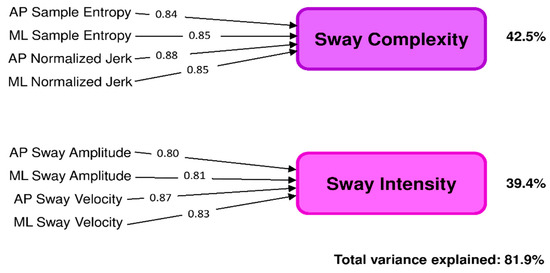 Result of the principal component analysis. Eight wearable-sensor-based variables descriptive of trunk sway during the instrumented modified Romberg test (reported on the left) were reduced to two “latent variables” (principal components) called “sway complexity” and “sway intensity”. Arrows report significant factor loadings (>0.60). The percentage of variance explained by each component and the total variance is given on the right.