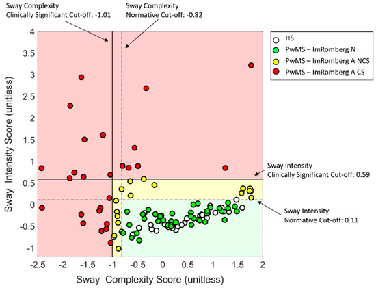 By applying the thresholds defined above and reported in Figure 2 (i.e., normative cut-offs and clinically significant cut-offs), we found that 26 (32%) PwMS (red circles in Figure 2) showed at least one clinically abnormal instrumented score (i.e., sway complexity and/or sway intensity outside clinically significant cut-offs, the light red area in Figure 2).