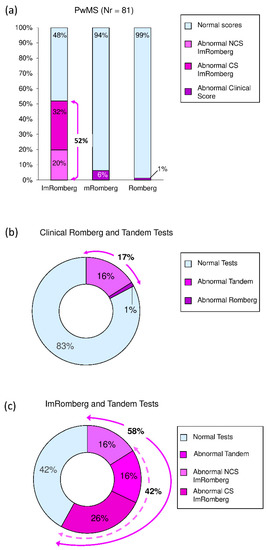 (a) Percentage of people with MS (PwMS) showing abnormal ImRomberg test and abnormal clinical scores on modified Romberg (mRomberg) and Romberg tests. (b) Percentage of PwMS with abnormal tandem gait test (light violet) and with normal tandem but abnormal clinical Romberg test (dark violet). (c) Percentage of PwMS with abnormal tandem gait test (light violet) and with normal tandem but abnormal ImRomberg (light and dark magenta). ImRomberg was considered abnormal in case of sway complexity and/or sway intensity score outside normative cut-offs (two-headed dashed arrow). Abnormal NCS: abnormal, not clinically significant (sway complexity and/or sway intensity outside normative cut-offs but inside clinically significant cut-offs); abnormal CS: abnormal, clinically significant (sway complexity and/or sway intensity outside clinically significant cut-offs).