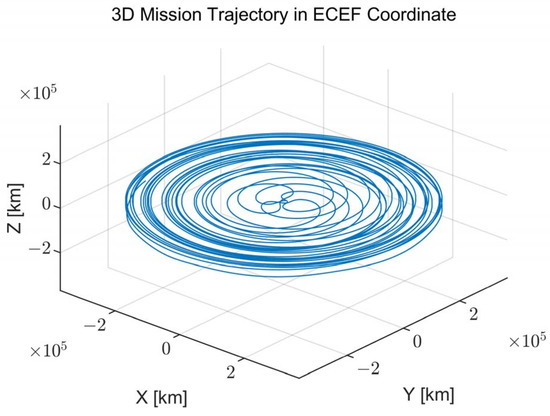 Overall Moon exploration mission trajectory in the earth-centered, earth-fixed (ECEF) coordinate.