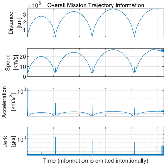 The mission trajectory of the spacecraft for the exploration of the Moon is presented and analyzed in this section. The overall mission trajectory in the earth-centered, earth-fixed (ECEF) coordinate is presented in Figure 1. The Earth is located at the origin point of the coordinate, and the Moon exploration spacecraft maneuvers toward the Moon. The spacecraft is assumed to be pointing to Earth during the maneuver (i.e., no attitude maneuver), indicating that the GNSS antenna is always facing the Earth. The mission trajectory has a gradually increasing circle-like shape. The distance, speed, acceleration, and jerk values of the spacecraft during the Moon exploration mission are presented in Figure 2. From this figure, the distance of the spacecraft is depicted as several arc shapes with respect to time, while the height of the arc gradually increases. Additionally, large acceleration and jerk occur when the distance becomes close to Earth due to the strong propulsion power of the spacecraft, which is used for advancing further away.