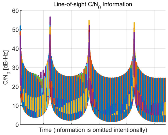 LOS information, such as the C/N0 and jerk value for each visible satellite, is calculated for the global positioning system (GPS) using the GPS orbit information and presented in Figure 3 and Figure 4, respectively. For the calculation of the LOS information, the side-lobe signal of the transmitter antenna pattern is utilized. Each color in the figures indicates a different GPS satellite. As expected, the C/N0 information in Figure 3 has a reversed arc shape because the free space loss is increased when the distance between the spacecraft and the GPS satellites increases. The C/N0 has a range from 1.48 to 56.58 dB-Hz. The calculated overall LOS jerk information and the enlarged version of the maximum jerk region are presented in Figure 4. The jerks occur periodically due to the propulsion power of the spacecraft, and the magnitude of each jerk gradually decreases. The maximum jerk occurs at the beginning of the trajectory, and its magnitude is approximately 411 g/s, remaining for only 1–2 s.