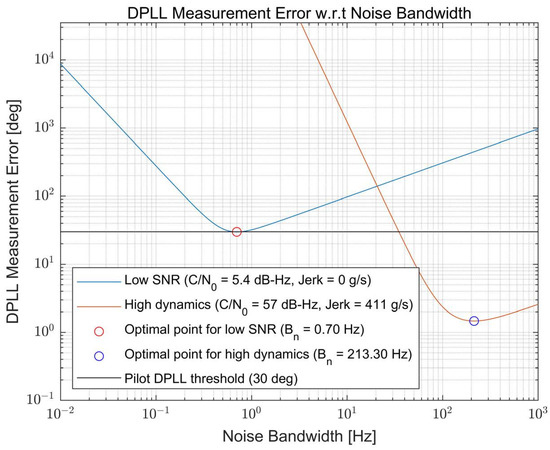 Examples of the overall measurement error calculation results for the extreme cases, namely low SNR and high dynamics conditions, are illustrated in Figure 5. Each condition is selected in consideration of the analysis result obtained from Section 2 where the maximum value of the C/N0 and the jerk are selected to be similar to the analysis result. However, the minimum value of the C/N0 is selected as 5.4 dB-Hz (not 1.48 dB-Hz, as can be observed in Figure 3) because it is the smallest C/N0 that the receiver can track in a theoretical sense (i.e., the smallest C/N0 where the theoretical measurement error is less than 30 degrees). The figure shows that the measurement error varies with the noise bandwidth value, and one optimal point at which the measurement error is minimized exists for each condition. As expected, the optimal bandwidth for the low SNR condition is very narrow ( = 0.7 Hz) to suppress the large noise effect due to the very low C/N0 of 5.4 dB-Hz. Furthermore, the optimal bandwidth is very wide ( = 213.3 Hz) for the case of the high dynamics to track fast variations in the signal component.