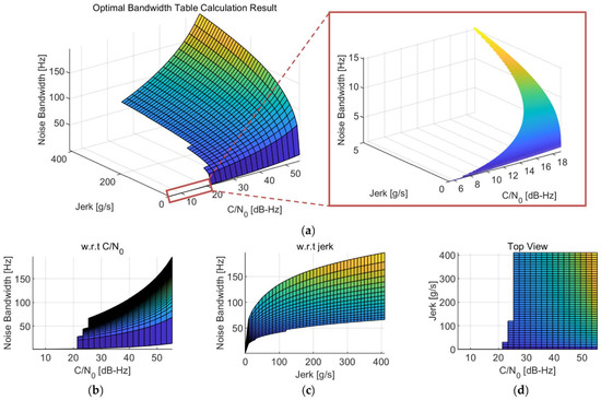 Result example of the generated optimal bandwidth table: (a) Overall shape; (b) Optimal bandwidth with respect to the C/N0; (c) Optimal bandwidth with respect to the jerk; (d) Top view.