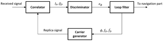 A simplified structure of a conventional carrier tracking loop of the GNSS receiver is shown in Figure 7. Note that the code tracking components are omitted in the figure for the simplicity of discussion. The carrier tracking process starts at the correlator. The correlator correlates the received signal transferred from the radio frequency front-end and the replica signal produced in the carrier generator. Then, the discriminator measures the difference () of the carrier phase between the two signals using the in-phase and quadrature prompt correlator outputs (, ), which are inputted to the discriminator. The discriminator output is filtered in the loop filter, with the loop filter also estimating the differential components that depend on the loop filter order: the carrier phase (), Doppler frequency (), and Doppler rate () in the case of the third-order DPLL. Finally, the carrier generator and the NCO (which is omitted in the figure) generate a new replica signal to close the loop.