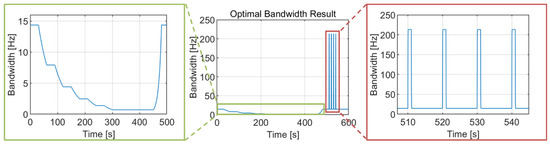 Optimal bandwidth variation during the simulation. The noise bandwidth is narrowed to 0.7 Hz as the C/N0 is lowered to 5.4 dB-Hz and widened to 213.3 Hz as the jerk dynamic stress increases to 411 g/s.
