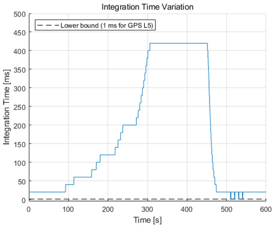 The integration time variation during the simulation is illustrated in Figure 11. This variation has an almost inversely proportional shape with the noise bandwidth of Figure 10 to maintain a constant normalized bandwidth value, varying with a step of (20 ms for this study). The integration time increases to 420 ms for 300–450 s because the noise bandwidth is narrowed to 0.7 Hz in that region. For the high dynamics region (after 500 s), the integration time reduces to 1 ms, which is a lower bound for the GPS L5 signal when the jerk dynamic stress exists.