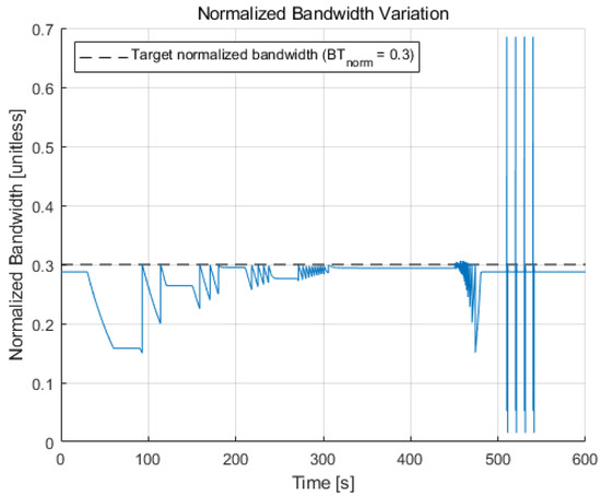 Normalized bandwidth variation during the simulation. The normalized bandwidth is maintained below the target normalized bandwidth value (i.e., 0.3) most of the time, except for the high dynamics region due to the unavoidable limitation of the integration time by the lower bound condition.