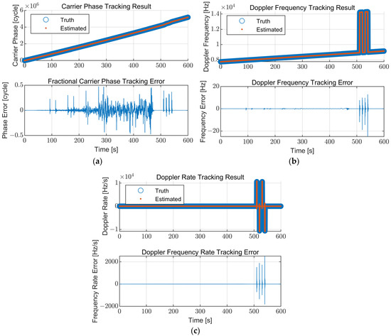 Carrier tracking results of the proposed table-based adaptive DPLL algorithm: (a) Carrier phase; (b) Doppler frequency; (c) Doppler rate. The proposed algorithm stably tracks the signal components for the simulation scenario.