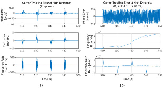 Carrier tracking error at the high dynamics region (500–550 s): (a) Proposed algorithm; (b) Fixed bandwidth (Bn = 15 Hz, T = 20 ms). The fixed-bandwidth loop loses lock at approximately 510 s immediately after the jerk dynamic stress occurs. The error for the proposed algorithm increases temporally while the jerk dynamic stress exists and converges to zero immediately after disappearing.