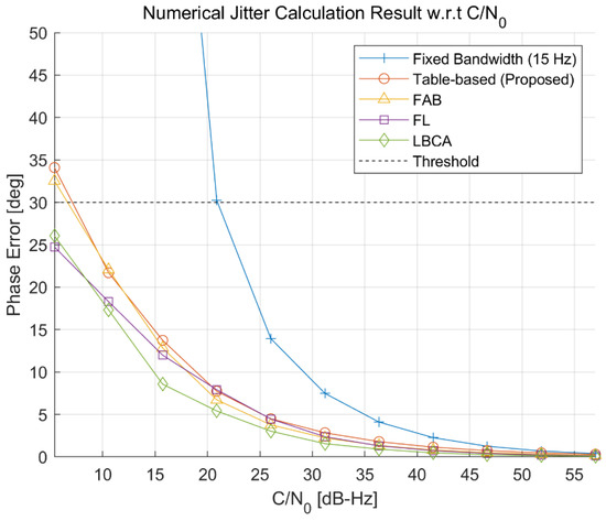 Numerical jitter calculation result with respect to the C/N0. The proposed algorithm has a similar performance to the fast adaptive bandwidth (FAB). Fuzzy logic (FL) and loop-bandwidth control algorithm (LBCA) have slightly better performances.