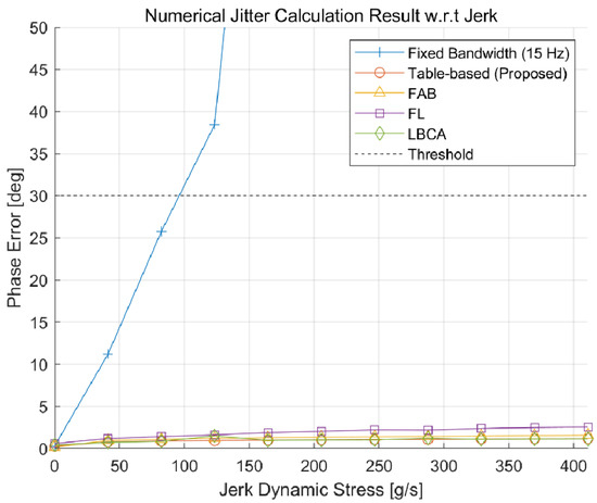 Numerical jitter calculation result with respect to the jerk dynamic stress. All adaptive DPLL algorithms have similar performances.