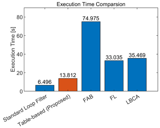 The theoretical computational complexities of each adaptive DPLL algorithm are presented in Table 3. To concentrate on the core of the adaptive algorithms, the estimators for the SNR and the dynamic stress are excluded in this evaluation. The proposed algorithm has the smallest amount of calculation because it only contains relatively simple calculations for the determination of the table index and the calculation of the next integration time. On the other hand, the FL has the largest amount of addition (subtraction) and multiplication calculation, while the FAB and LBCA have seventh-root calculations and exponential functions that are relatively heavy operations, respectively. The execution time measurement results for each algorithm are presented in Figure 18. Each algorithm is implemented in C, and the execution time is measured using the clock() function with 109 iterations for each algorithm. Each execution time result of the adaptive DPLL algorithm contains the execution time of the standard loop filter. The comparison results show that the proposed algorithm has a 2.4–5.4 times faster execution time compared to the other algorithms.
