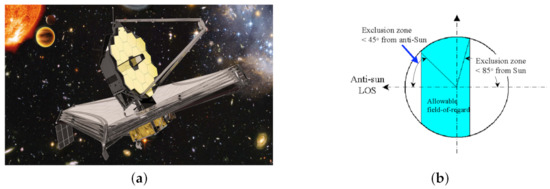 (a) The James Webb Space Telescope artist rendition. Source: European Space Agency. (b) JWST Field of Regard with two exclusion zones [3].