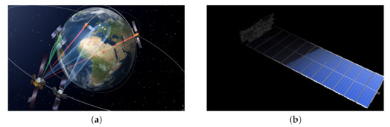 - In addition to implementing common frame dynamics, this paper also extends the constrained tracking problem in presence of dynamic constraints. These types of constraints are important in spacecraft formation flying, such as the European Data Relay System (EDRS) in Figure 3a and the upcoming Starlink satellite constellation with the purpose of providing low-latency satellite internet access globally (Further information can be seen at starlink.com (accessed on 1 March 2020).) in Figure 3b. Each satellite is equipped with a laser communication device and receiver with strict pointing inclusion constraints to transmit data across the constellation.