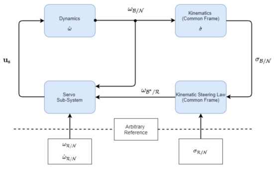 The unconstrained tracking problem can be solved using Lyapunov’s direct method which allows similar methods in developed in backstepping control. This results in producing a cascaded control design where the output of one sub-system is the input of another [19]. Figure 6 describes the control design used in [20]. The kinematics block represents Equation (14), the MRP kinematic differential equation in the Common Frame. The dynamics block is represented by Equation (15), the rigid body dynamics of a spacecraft with a RW array. The outer loop of the control block is the Kinematic Steering Law, responsible for controlling the attitude of the spacecraft and taking inputs from the reference , and the current attitude . The inner loop is the servo sub-system, responsible for controlling the angular velocity and takes inputs from the reference , the solution of the kinematic steering block and the current angular velocity from the dynamics block .