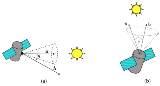 Figure 7 is a diagram for the static exclusion and inclusion constraint. For the static exclusion constraint, the objective is to maneuver the spacecraft with sensitive equipment in the body frame defined by the unit vector while avoiding the exclusion cone defined by a celestial pointing unit vector , with a minimum security angle of .