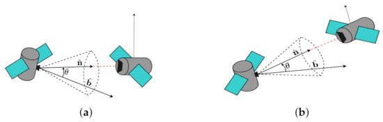Dynamic Inclusion Constraint Geometry. A laser device is attached to a satellite on the left and must be pointed at another satellite’s receiver on the right. (a) is the initial position of the satellites and (b) is an arbitrary position after some specified time.