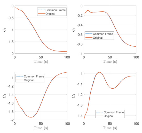The constraints represented by Equations (33) and (34), representing how close the boresight approaches the security angle of the constraint are plotted in the transient time in Figure 10 and Figure 11. It is shown that the first two exclusion constraints, and are more negative while the last two exclusion constraints and are less negative as an effect of Common Frame terms. In terms of the inclusion constraint are relatively more positive in the common frame.