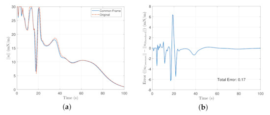 The norm of the control effort was taken and the results are shown for the transient time of the maneuver in Figure 13. In Figure 13a, it is shown that the overall control effort is significantly reduced at about 7 seconds and that the common frame formulation converges faster than the original formulation as a result of additional terms presented in the servo subsystem as well as the steering law presented in Section 3. The average error throughout the entire maneuver is about 16%.