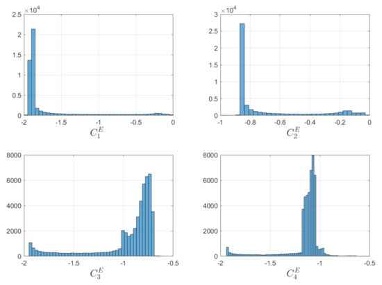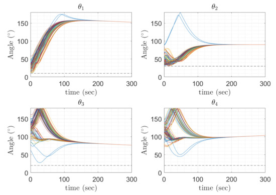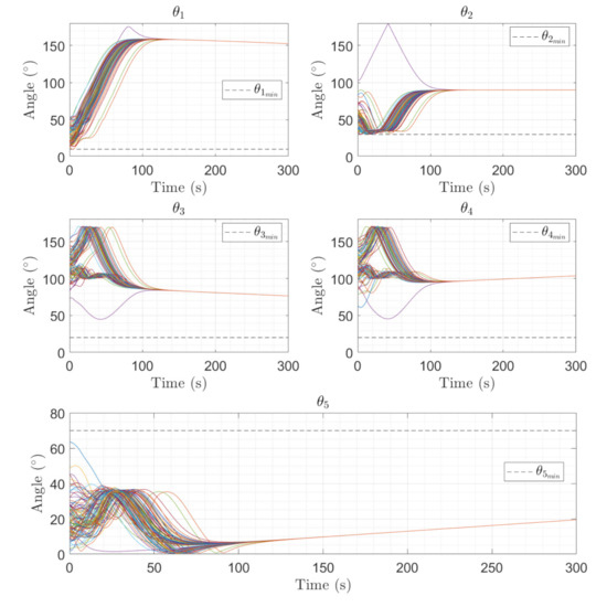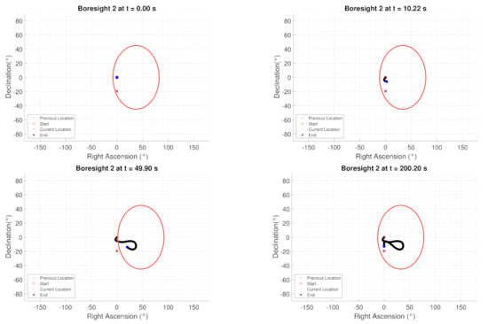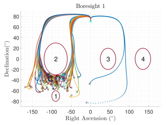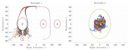 Figure 14 show the boresight trajectories given 100 runs with variance of given by the Table 3. The initial position of the boresights are marked as black circles and the end position is marked as a cyan x. The variance is multiplied by a random normal distribution given by the MATLAB function . Figure 15 shows the angle progression of boresight 1 with respect to the four exclusion constraints as well as the angle progression of boresight 2 with respect to the inclusion constraint, the dashed line is the minimum angle for each constraint from Table 2. In Figure 16, the histogram of the calculated constraints throughout the entire maneuver are shown for each constraint.