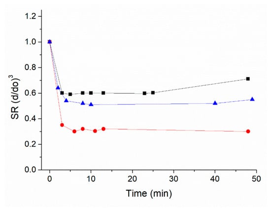 Nanogels were synthesized from a combination of acrylamide-monomers (acrylamide, tert-butylacrylamide), methacrylic acid, and N,N′-methylene bisacrylamide as a reticulating agent, resulting in homogeneous nanomaterials with a Z-average of 89.5 ± 0.5 and a polydispersity index (PDI) of 0.18 (details in Supplementary Materials Sections S1 and S2; Table S2. Zeta potential and Z-average of the nanogels and Figures S1 and S2), similar to what is reported in [23]. Nanogels in water suspension were tested for solvent responsivity by monitoring the shrinking over time (≤30 min) when a low-viscosity solvent was added. Figure 1 shows the deformation of the nanogels in the isopropanol:water mixtures, expressed as a swelling ratio (SR) where SR = V/Vo = (d/do)3, d being the diameter of the nanogel in the solution and do the diameter in pure water [20]. Results showed that nanogels shrank to SR ~0.3 of the initial hydrated nanogel’s volume when placed in the isopropanol environment, confirming significant deformability.