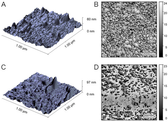 Surface topography was studied using an NT-MDT Solver Pro system equipped with an S7 scanner. All samples were imaged in semi-contact mode using silicon tips (NSG-11, NT-MDT, 10 nm nominal tip radius, resonance frequency of 181 kHz), collecting 1 × 1 µm, 512 points resolution images, acquired on different regions of each sample. AFM data were analyzed with the support of Gwyddion analysis software 2.2. Topography and phase contrast data were collected.