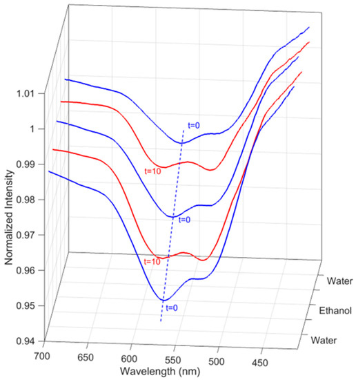 The nanogel–POF interface behaves as a reversible optical switch. The sensor was tested with the following cycle: water was placed on the interface (start of the cycle; t = 0, blue lines), followed by ethanol:water RI 1.339 (10% w/v), let incubate for 10 min, and then measured (t = 10, red lines). At the cycle’s completion, the sensor was placed in water, incubated for 10 min, and the next cycle was started (t = 0, blue line). Three out of five consecutive cycles performed on the sensor are reported. It can be observed that when alternatively placed in water (blue line) and ethanol:water RI = 1.338 (red line), the optical minima shift between typical positions, hinting at possible uses of the nano-gel-POF as an optical switch.