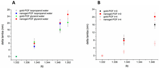 As expected, the Δλmin linearly correlated to the increment in RI of the surrounding medium [26]. As shown in Figure 4A, the shifts in the optical minima at the solvent deposition time (Δλ@t = 0), plotted as a function of the RI of the solvent mix, confirmed the predicted linear correlation between the Δλ and the surrounding medium’s RI in a range of RI encompassing 1.331 to 1.352 both for the bare gold and the nanogel–POFs.
