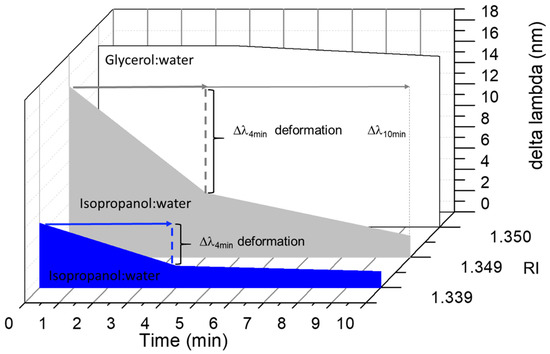 Thus, the nanogel–POF can be used as a sensory system in which the optical response is modulated by more than a single characteristic of the surrounding medium, i.e., the RI and the shrinking effect. The nanogel–POF allows a two-dimensional measure of the analyte solution, offering the possibility to report on complex environments. As a confirmation, the nanogel–POF was tested in different environments, either suitable to induce shrinking (isopropanol:water) or solutions not altering the 3D nanogel structure (e.g., glycerol:water), and each was monitored [27]. Figure 5 shows that at time t = 0, the optical readouts (Δλ shifts; details in Supplementary Materials Section S3, Figure S3) correlated to the RIs of the surrounding environments, in accordance with the previous data (Figure 4A). Thus, the first level of information accessed using the nanogel–POF system was the RI of the surrounding solution. For the nanogel–POF incubated for longer times in a surrounding environment, the possible extra-deformations of the nanogel structure report on the chemical nature of the surrounding media. These additional volume-to-phase transitions are perceived as further time-dependent Δλ shifts. As a result, the second level of information gained by this non-specific nanogel–POF is about the chemical nature of surrounding environments, enabling us to discriminate shrinkage from swelling compositions.