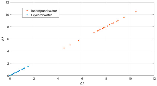 A proper dataset was acquired by testing the nanogel–POF sensors with two solutions, having the fixed and same RI = 1.349 while significantly differing in compositions (glycerol:water, or isopropanol:water). Consistent with the experimental data reported in Figure 5, the Δλ shifts for each solution were acquired after 4 min incubation. The procedure was repeated for n = 20 acquisitions for each solution to obtain a robust dataset to train and validate the prediction model. Figure 7 reports the scatter plot showing the dataset clustering. The overlapping of multiple measurements of the same class of solution accounted for the high reproducibility of the MathMaterial sensor response.