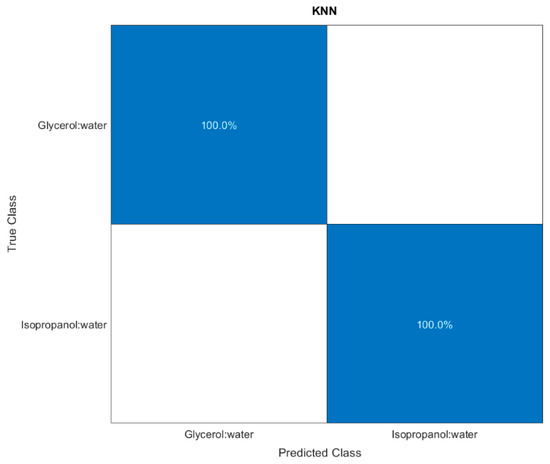 Next, the classification algorithms available on the MATLAB® toolbox were trained. From among all, the K-Nearest Neighbour (KNN) algorithm was chosen for its highest accuracy (100%), as shown by the confusion matrix reported in Figure 8.