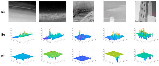We selected one representative image in each dataset. Using the baseline method and the method proposed in this paper to compare, and the final calculation result is shown in Figure 4. In each dataset, the size of small targets is not fixed, and the background is complex, accompanied by varying degrees of noise. The first image contains more PNHB and sharp edges, which cause some baseline methods to fail to detect correctly, and more noise remains. The second image contains more target-like points, and the true small targets have a small contrast with their background neighborhoods. The true small targets are submerged in the background, and most baseline methods cannot handle the target-like points. The background of the third image is complex, but the true small target has a large contrast with its background neighborhood, so most of the baseline methods can effectively detect the true small target. The fourth picture is brighter overall, and there are buildings, and some baseline methods fail. The fifth picture contains complex buildings with many corners, and the true small target has a small contrast with its background neighborhood. Except for the algorithm proposed in this paper, all baseline methods cannot be detected normally. In a word, the algorithms proposed in this paper can effectively capture true small targets, and the effect is better than the baseline method.