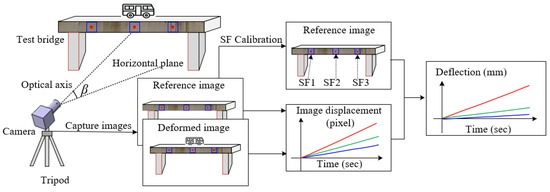 The principles behind computer vision-based deflection monitoring methods are straightforward and easy to implement. The first step is to capture video images of a test structure using a digital camera. Then, image displacements of measurement points are tracked in a series of images using certain digital image processing algorithms (e.g., intensity-based template matching algorithms or feature-based image registration algorithms). Finally, image displacements are converted to actual physical displacements using the pre-calibrated scale factor (SF), which can be determined based on the geometry relationship between the image and the test structure. Recently, the powerful digital image correlation (DIC) [11,12,13,14] technique, which is widely used in the experimental mechanics community for full-field displacement and strain measurements, has been successfully used for motion tracking of video images of engineering structures with artificial targets or natural textures. Based on the state-of-the-art DIC algorithm, an off-axis DIC-based video deflectometer was established by the present authors. Although DIC can precisely detect subtle image displacements, accurate determination of the SF at each measurement point which directly determines the final accuracy of measured deflections remains a challenge.