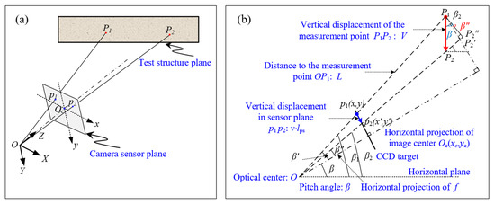 In Figure 2b, we assume that measurement point P1 on the structure plane moves to P2 with a vertical displacement V. Correspondingly, point p1(x, y) in the camera sensor target moves to point p2(x’, y’), v is the image displacement in pixels. Since vertical displacement is the primary displacement component in structure deflection measurement, the horizontal image displacement is approximately zero. Based on the principle of trigonometric geometry, we have , therefore