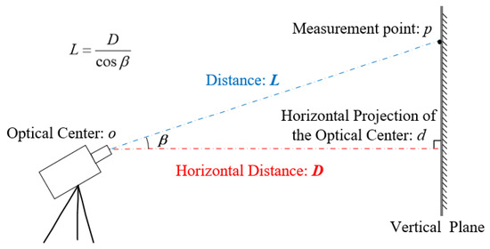 Two distances are represented in Figure 3. Horizontal distance D is the length from the optical center o to the horizontal projection of the optical center d, the accurate position of d is difficult to determine in practice. Distance L is the length of the line from the optical center o to the measurement point p, which is very clear and easy to measure. To facilitate comparison, we will use Equation (b) to replace Equation (10). Equation (b) resembles Equation (9) but is simpler and more practical since the distance L is easier to measure than the horizontal distance D. As such, it can be called an improved Feng’s method.