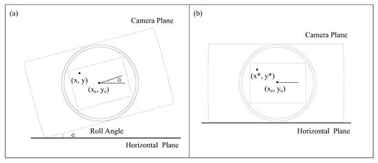 Schematic diagram of camera roll angle correction: (a) original model; (b) corrected model.