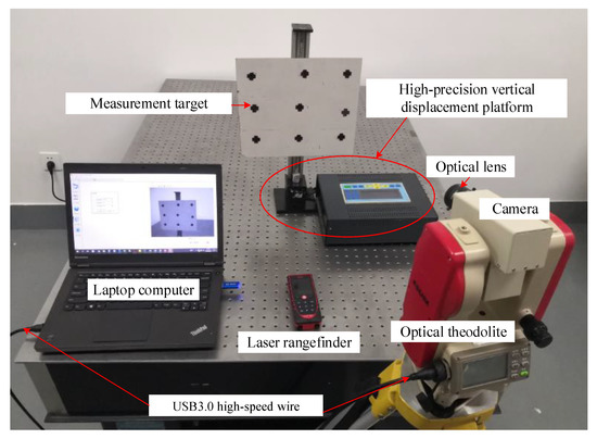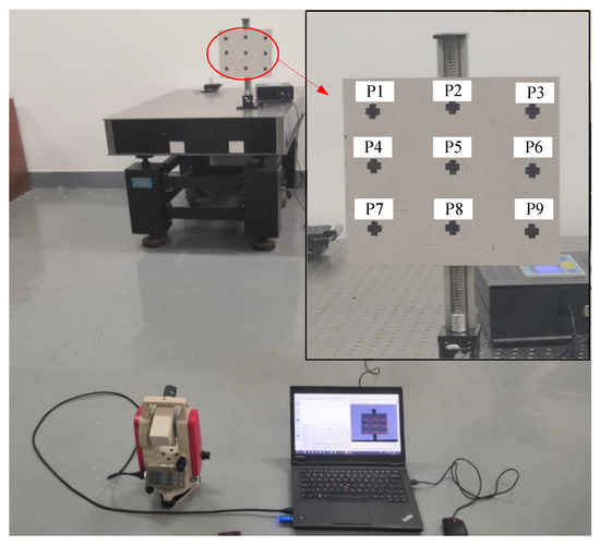 A picture of the experiment setup for examining the accuracy of these SF calibration methods is presented in Figure 6. The test structure was a 250 mm × 250 mm plate, and the cross markers were pasted to 9 different positions of the test structure as measurement points. In this way, the laser rangefinder can locate the measurement points and obtain the distance of each point. At the same time, we can locate these measurement points in the image to obtain the corresponding image coordinates of each point. The test structure was fixed on the high-precision vertical displacement platform, which was placed vertically and fixed on a vibration isolation platform. The video deflectometer was placed on the ground to shoot the surface of the test structure with a pitch angle. The bubble of theodolite was adjusted to make the roll angle almost equal to zero.