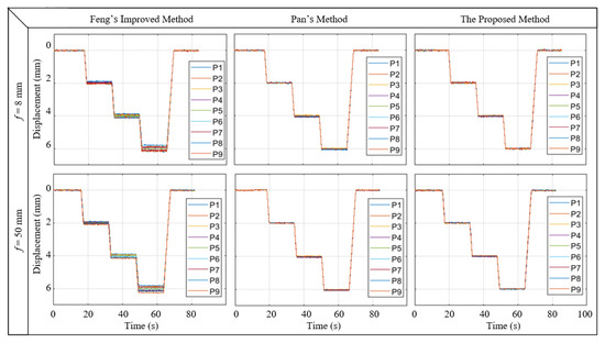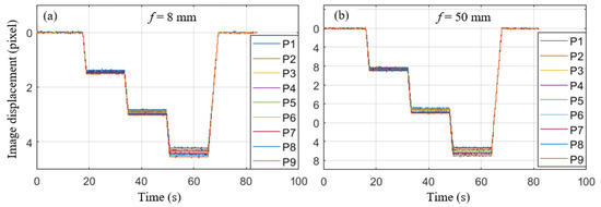 The image displacement-time curves of nine measurement points for lenses using two different focal lengths are shown in Figure 7. It is seen that the image displacements of these point on the test structure with only rigid body translation are not all the same. It is caused by the fact that the optical axis of the camera is not perpendicular to the surface of the test structure and the different distances from the optical center to each measurement point. In off-axis conditions, the SF of each point in the image is distinctly different.