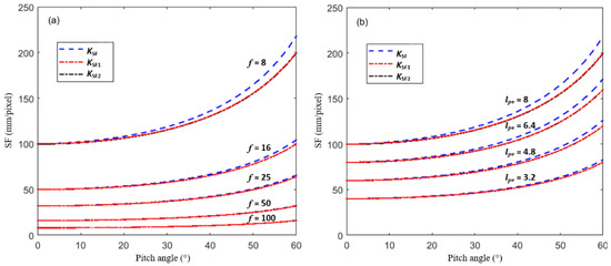 SF variation with the camera and lens parameters: (a) SF-pitch angle curve for different focal lengths of the lens, (b) SF-pitch angle curve for different pixel sizes.