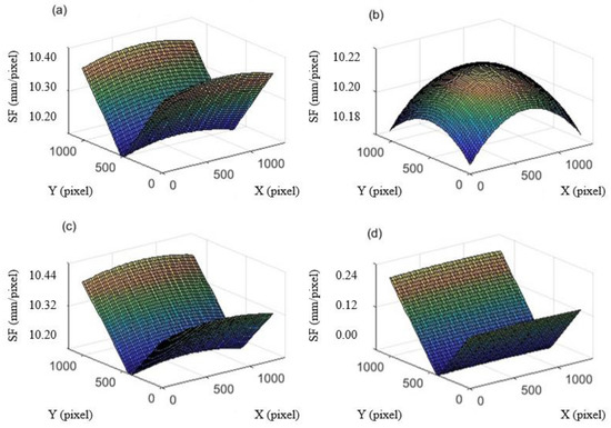 As shown in Figure 10, there is a big difference in the distribution of full-filed SFs between the proposed KSF and Pan’s KSF2, and KSF2 is relatively small. For accurate calibration, SF is greatly affected by the image y-coordinate of the measured point, but less affected by the image x-coordinate. Additionally, it is affected by the position of the measured point after deformation. The SF is the smallest when the y-coordinate is at the center of the image after deformation. For approximate calibration, the influence of the x-coordinate and y-coordinate on KSF2 is almost the same. The KSF2 of the measurement point at the center of the image is always the largest, no matter before or after deformation. It can be seen from Figure 10d that the difference between KSF and KSF2 is almost zero when the y-coordinate of the measured point moves to the image center after deformation. It indicates that the KSF almost equals the KSF2 when 𝑦’ is in the middle position.