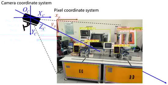 The YOLOv5 model is able to output the position information of the detected target while recognizing the target. The color image and depth image are generated when using RGB-D camera for detection, and the position coordinates are obtained by converting the pixel coordinate system to the camera coordinate system to obtain the 3D position coordinates of the detection target. In order to obtain more reliable depth information, the RGB-D camera is usually calibrated for depth before detection [,]. The pixel coordinate system and the camera coordinate system are shown in Figure 1. Usually, the upper-left pixel point of the image is used as the origin position of the pixel coordinate system, and the pixel coordinate system axes are shown as the red arrows in Figure 1. The center coordinate point of the detected target is obtained and projected into the pixel coordinate system of the depth image, so the pixel value of the center coordinate point of the detected target in the depth image is the distance of the detected target to the RGB-D camera. Taking the RGB-D camera as the origin of the camera coordinate system, the camera coordinate system axes are shown as the blue arrows in Figure 1.