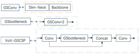 GSConv and Slim-Neck methods were added to the YOLOv5-6.0 network model by replacing Conv in the Neck layer of the YOLOv5-6.0 version of the network with the lightweight convolutional method GSConv. YOLOv5 backbone feature extraction network adopts a C3 structure, with many parameters in the training process. The use scenarios are easily restricted in the use scenarios such as intelligent monitoring systems. With challenges in applying intelligent surveillance systems in mobiles and embedded usage settings, the C3 module is replaced by the VoV-GSCSP module. The structure of GSConv and VoV-GSCSP modules is shown in Figure 3.
