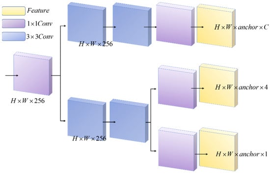 Song et al. [] investigated the inherent conflict between target detection classification and position regression. Zheng et al. [] improved YOLOV3 by adding Decoupled Head, which improved the performance metrics of the model, and found that the coupled detection head of the YOLO series network degraded the performance to some extent. Li [] et al. improved YOLOv4 by decoupling the classification and regression tasks to enhance the performance of the model and applied to the detection of ship targets. The structure of the Decoupled Head is shown in Figure 4. The Decoupled Head goes through a 1 × 1 convolution operation and then two parallel 3 × 3 convolution operations, one of which passes through a 1 × 1 convolution layer and is dimensionally reduced to complete the task of identifying the target class, and the other passes through two 3 × 3 convolution layers and then uses two parallel 1 × 1 convolutions for the task of target location and confidence. In summary, Decoupled Heads improves the performance of the model by solving the target category (classification problem) and determining the target location (regression problem) separately.